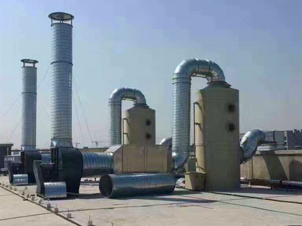 上圖中黑色的風(fēng)機為防爆型玻璃鋼離心風(fēng)機,廢氣處理塔的材質(zhì)選擇的是pp材料,管道則使用的是碳鋼材料。