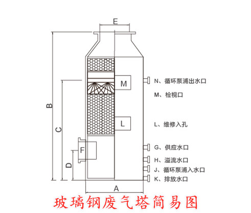 廢氣由玻璃鋼離心風機壓入凈化塔內外向夾套組成的均壓室,通過勻風格柵使廢氣勻速進入一級填料功能段,進行一級噴淋,使氣液二相得到一次充分接觸,經一級處理后的廢氣用由漸擴段減速進入二級填料噴淋功能段,再使廢氣得到更充分的氣液二相接觸反應,然后再經脫液器脫液除霧后,尾氣由排出口經風道排入大氣。