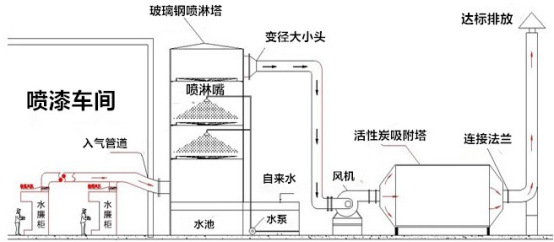 注:上述的處理方式為大部分工業場合的噴漆廢氣處理方式,當在廢氣中除了噴漆廢氣之外還包含其它成分的廢氣之外,需要對處理設備進行合理的選擇。